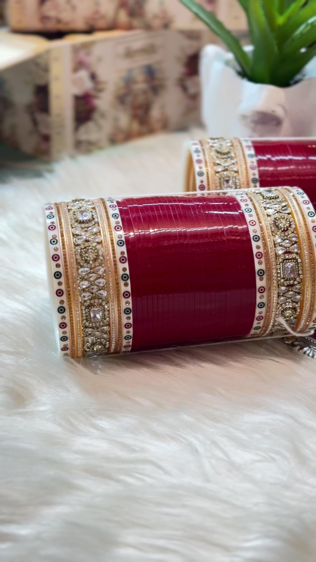 These stunning red bridal bangles are crafted with a glossy glass finish and adorned with intricate Kundan-style embellishments, giving them a royal and traditional appeal. Perfect for weddings, festive occasions, or cultural c...